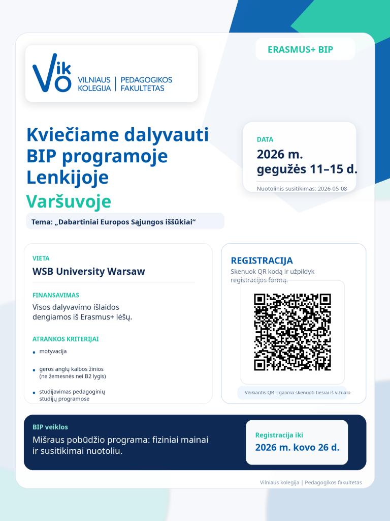 Vilniaus kolegijos Pedagogikos fakulteto lektorė Dovilė Miknaitytė 2026 m. vasario 24 – 27 d. dalyvavo tarptautinėje savaitėje Arteveldės Taikomųjų mokslų universitete (Belgija). Vizito metu lektorė vedė kūrybines dirbtuves studentams „Musical Story Lab“ tema. Tai žaismingos…