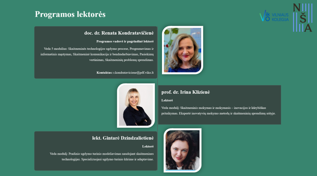 Doc. dr. Renata Kondratavičienė – programos vadovė ir viena iš trijų lektorių. Ji veda net penkis modulius, todėl susieja programos turinį į nuoseklią, mokytojui patogią sistemą. Apibūdindama programą, ji sako: „Jei norite mažiau chaoso ir daugiau aiškumo dirbdami su skaitmeninėmis priemonėmis – čia susikursite sistemą ir patirsite ją praktiškai.“