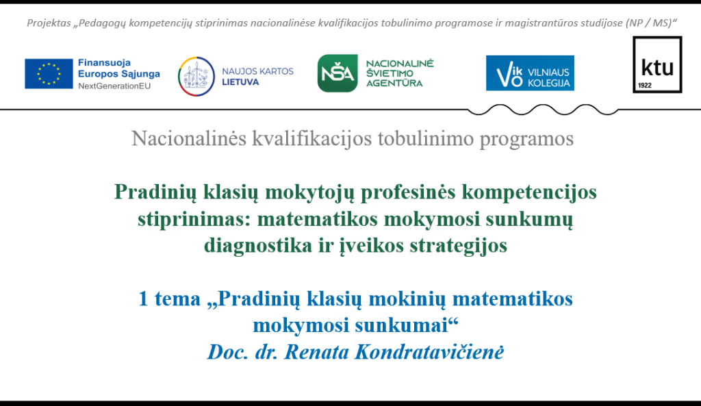 Vilniaus kolegijos Pedagogikos fakulteto docentė dr. Renata Kondratavičienė dalyvauja nacionalinėje kvalifikacijos tobulinimo programoje „Pradinių klasių mokytojų profesinės kompetencijos stiprinimas: matematikos mokymosi sunkumų diagnostika ir įveikos strategijos“.