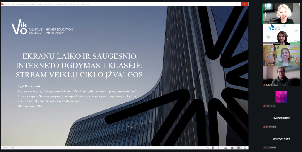 Pirmoji savo tyrimą pristatė 1 kurso studentė, Jonavos rajono Šveicarijos progimnazijos Užusalių skyriaus pradinių klasių mokytoja Eglė Petrėnienė, skaičiusi pranešimą „Screen Time and Safer Internet Education in the 1st Grade: Insights from a STREAM Activity Cycle“. Jos pasirinkta tema iš karto palietė tai, su kuo šiandien susiduria beveik kiekviena šeima ir kiekvienos pradinės klasės mokiniai ir mokytojai: ekranas vaikų kasdienybėje atsiranda labai anksti, dažnai dar anksčiau nei savarankiškas skaitymas, todėl saugesnio interneto klausimas pirmoje klasėje nebegali būti laikomas tik namų rūpesčiu. Mokytoja E. Petrėnienė savo pristatyme parodė, kad ši tema tampa daug suprantamesnė tada, kai su vaikais apie ją kalbama ne draudimų kalba, o per veiklą, patirtį ir aiškius susitarimus.